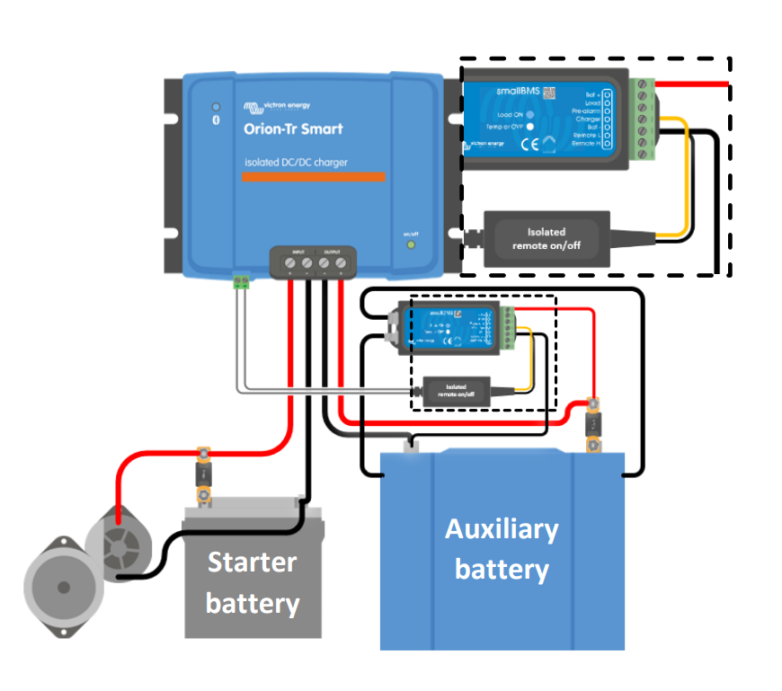 In the Orion-Tr DC-DC chargers, the remote turn-on circuit is referenced to the primary battery (e.g. starter battery). The Orion-Tr DC-DC Charger Isolated Remote Cable is intended for applications where the on/off signal is referenced to the secondary battery (e.g. lithium battery with BMS).