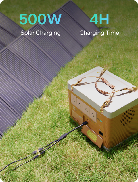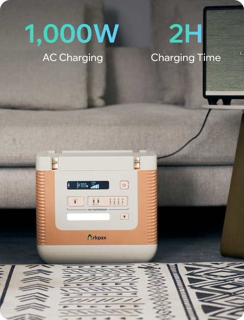 Ark unterstützt Solarladung, AC-Ladung, Auto-/RV-Ladung usw. mit einem AC-Eingang von bis zu 1000W, in Verbindung mit 200W-Solarmodulen (optional), dauert es nur 2 Stunden, bis das Gerät vollständig aufgeladen ist.
