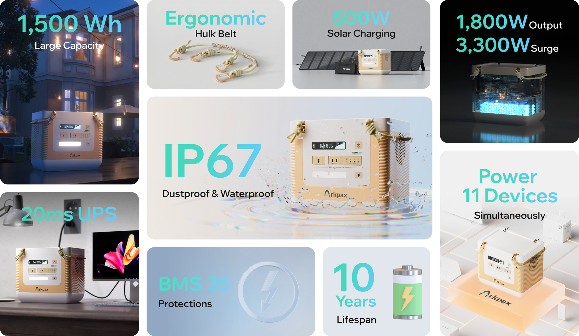 Arkpax bietet eine zuverlässige Stromquelle mit einer riesigen Kapazität von 1.500 Wh für unterwegs oder zu hause. Sie kann Ihre elektronischen Geräte stunden- oder sogar tagelang am Laufen halten und ist damit der perfekte netzunabhängige Begleiter