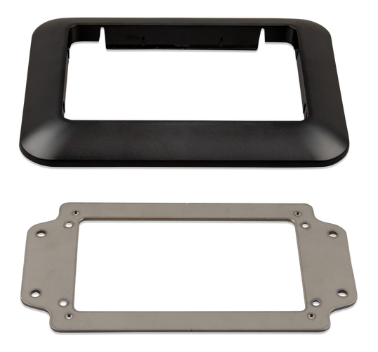Dieser Adapter ist so konzipiert, dass der CCGX-Ausschnitt einfach durch den neueren GX Touch ersetzt werden kann. Der Inhalt der Verpackung besteht aus der Metallhalterung, der Kunststoffblende und vier Befestigungsschrauben.